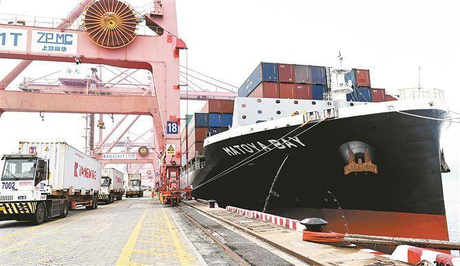 為應對國慶期間的作業(yè)高峰,海天碼頭在設備和人員方面做足準備。昨日,碼頭21臺橋吊“火力全開”,場內(nèi)作業(yè)龍門吊達54臺,集卡拖車總計108部全部參與作業(yè),助力“中國制造”走向全球。
