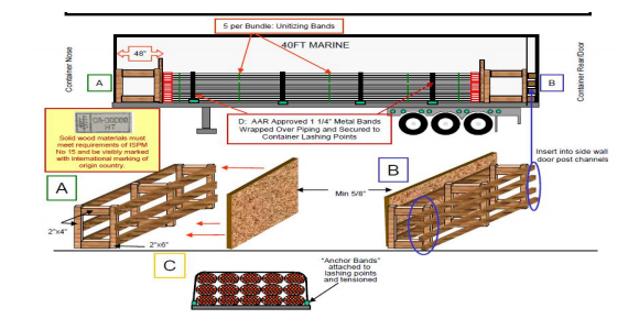 長條型鋼材貨物裝載對端壁和箱門要特別注意防護(hù),對集裝箱兩端一定要加襯墊,貨物與集裝箱有空隙必須支撐、塞緊。與底板接觸如采用方木撐墊,建議木條斜跨集裝箱多根底橫梁,避免集中受力產(chǎn)生損失。如因捆扎裝箱不規(guī)范導(dǎo)致的箱損、貨損,所有責(zé)任及費(fèi)用均要承擔(dān)的。在此,我們整理了長條型鋼材貨物裝載方法建議,供您參考。