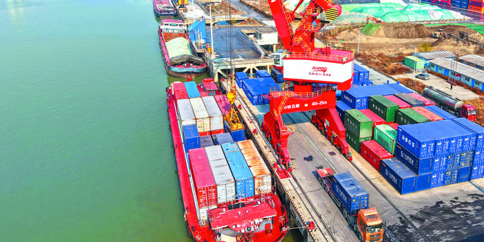 在巢湖港口碼頭一派繁忙景象,大型門機(jī)正在吊裝集裝箱至貨輪上。這批裝載各種機(jī)械與新能源設(shè)備的標(biāo)準(zhǔn)集裝箱的外貿(mào)貨物,將從巢湖港駛向上海港,經(jīng)過(guò)50個(gè)小時(shí)后抵達(dá),然后在上海洋山港直接換裝海船出口。巢湖港到上海港直達(dá)航線正式開(kāi)通,打通了巢湖及周邊企業(yè)貨物直達(dá)集裝箱班輪的通道,提供了一條“高效、快捷”的國(guó)際物流大通道,免去了之前需要在沿江港口中轉(zhuǎn)的流程,節(jié)省了大量運(yùn)輸時(shí)間,有效降低了企業(yè)海運(yùn)物流成本。