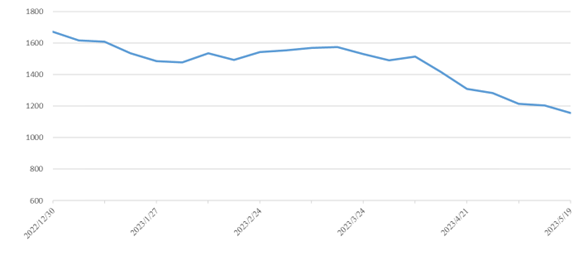 華南區(qū)域:受房地產(chǎn)行情震蕩影響,陶瓷需求恢復(fù)不及預(yù)期開窯率在50%左右,導(dǎo)致出運(yùn)量仍然處于低位。本期華南指數(shù)報收1546點(diǎn),環(huán)比下跌7點(diǎn),跌幅0.45%,其中華南至東北指數(shù)報收1059點(diǎn),環(huán)比下跌37點(diǎn),跌幅3.38%,華南至華北指數(shù)報收1429點(diǎn),環(huán)比下跌20點(diǎn),跌幅1.38%。